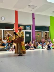 Dzieci z zachwytem słuchały, jak Pani Jesień opowiada o darach, które przynosi ta pora roku. W koszyku znalazły się m.in. kolorowe liście, kasztany, żołędzie, orzechy, jabłka i inne jesienne skarby.🍄🍎🥔