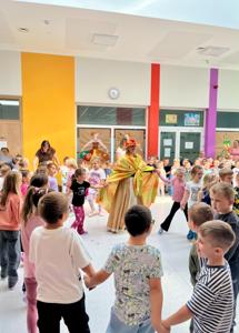 Nie zabrakło również wspólnego śpiewania piosenek i radosnych tańców – dzieci wspaniale bawiły się przy dźwiękach jesiennej muzyki. Na zakończenie tego spotkania każda grupa otrzymała mały upominek od Pani Jesieni